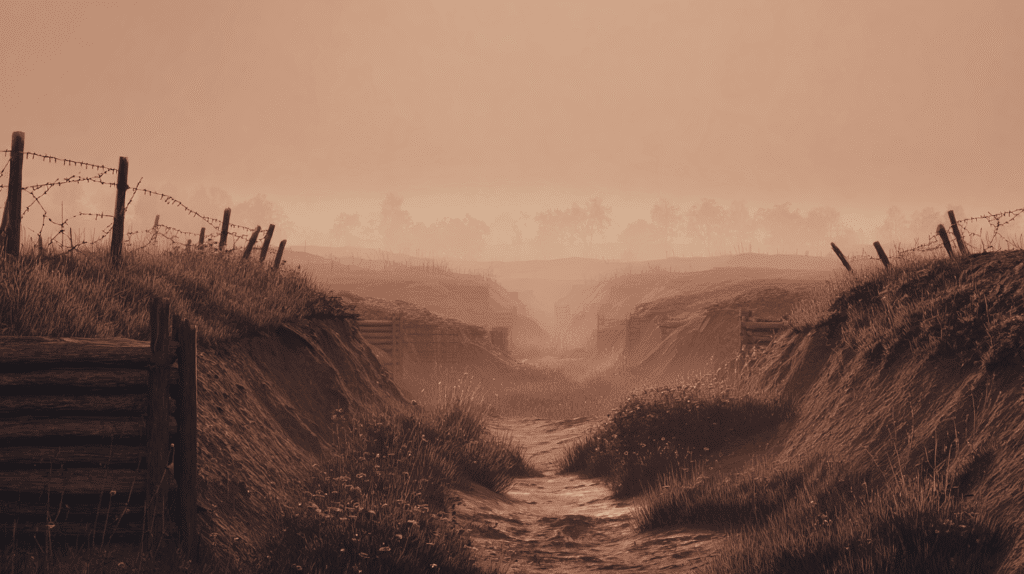Trench warfare dominated the Western Front from late 1914 through 1918. After the war’s initial mobile phase—German advance through Belgium and France halted at the Marne (September 1914) and the subsequent “Race to the Sea” where both sides attempted to outflank each other—opposing armies dug elaborate trench systems stretching from the English Channel to Switzerland. These weren’t simple ditches but complex defensive networks including front-line trenches, support trenches, reserve trenches, communication trenches, underground bunkers, barbed wire entanglements, and artillery positions.